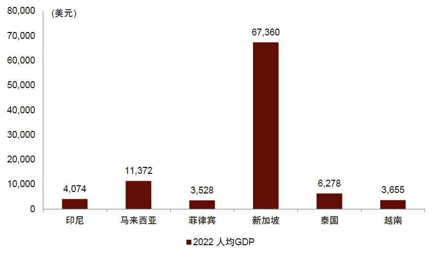 在经历了过去三十年的快速发展后,印尼目前已经成为东南亚最大的经济体,2022年占东南亚总体GDP的36%。从人均GDP角度看,印尼人均GDP在东南亚六国中处于相对较低水平,但我们看好其经济前景,主要由于:(1)消费市场不断扩大,而且增长潜力较大,印尼消费群体刚刚进入大众消费阶段,随着财富不断积累,消费品需求大幅增长;(2)在总统佐科·维多多执政下印尼大规模投资基建,我们认为此举有望开始在经济层面产生“涓滴效应”,为制造业产能扩大、贸易能力提升以及生活水平提高奠定基础;(3)资源驱动经济增长,印尼拥有丰富的矿产资源,其镍储量占到全球总储量的20%以上。