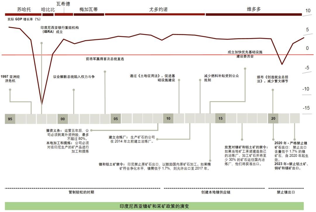 ► 资源民族主义背景下的“下游化”政策:得益于丰富的资源禀赋,大宗商品“下游化”成为维多多时代印尼推动经济增长的另一个核心政策。2022年,印尼镍产量占到全球总产量的48%左右(镍是生产电动汽车电池所需的关键材料)。2020年,印尼政府禁止镍矿石出口,迫使国外企业在印尼建设制造设施,在本地进行原材料加工。普华永道印尼公司估计镍“下游化”产生的附加值从2014年的11亿美元大幅攀升至300亿美元。此后,印尼将“下游化”这一战略性政策扩大至其它矿石,例如铝土矿(2023年6月禁止出口)和铜矿(彭博资讯报道[2],预计将在2024年5月禁止出口)。