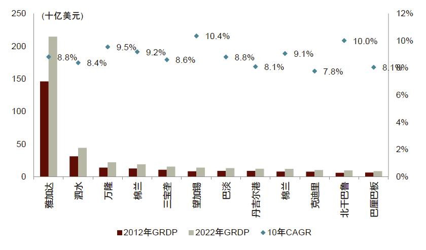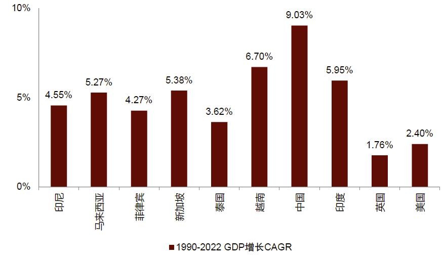 图表5: 过去十年印尼经济快速增长,但复合增长率仍然落后中国、印度和越南等经济大国