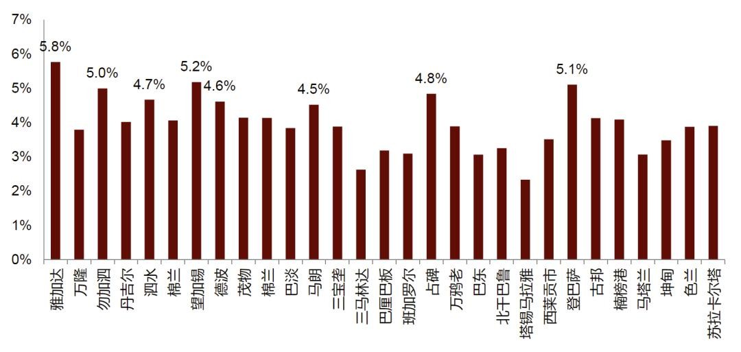 由于房价表现可能体现出整体消费需求差异,我们对比了印尼最大的18个城市的住房价格,并根据房屋规模进一步分类。整体来看,2018年以来印尼住房价格呈现稳健增长,增速达到3%-14%。包括两个一线城市在内的八个城市房价涨幅高于大雅加达地区(Jabodetabek),这表明雅加达以外房地产需求较高,而且存在开发机会,这与整体城镇化趋势保持一致。