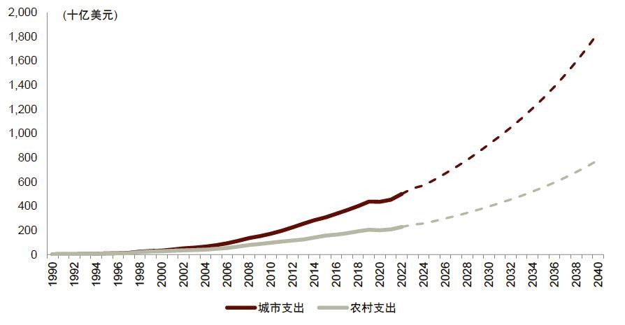 1990年以来,各收入区间的印尼家庭与此前相比均变的更加富裕,生活水平提高,其中月收入5,000美元以上的家庭数量与1990年相比增长了9倍。2022年印尼中产家庭达到2,060万户,占印尼家庭总数的29.4%左右,在推动印尼消费主义崛起与生活方式转变方面起到不可或缺的作用。在印尼,中产家庭主要是生活产品方面消费意愿和消费能力更高的城镇人口。Euromonitor的数据显示,2022年城镇消费支出占印尼总消费支出的68%,随着大城市的发展和城镇消费者财富持续积累,我们认为这一趋势或将更为明显。