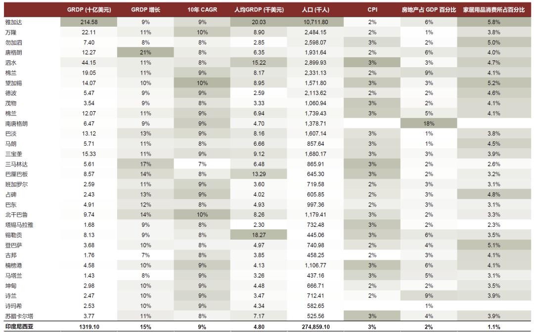 爪哇岛一直是印尼经济增长的驱动力,2022年爪哇岛在印尼GDP中的占比超过52%。受益于消费市场扩大以及相对完善的基建设施,爪哇岛中雅加达、泗水、三宝垄和万隆等核心城市的经济增速明显较高(从2012年到2022年,四个城市的名义地区生产总值CAGR高达8.4%-9.5%),另外我们注意到一些非一线城市,例如棉兰、望加锡、坦格朗和巨港,拥有较强增长潜力。我们认为强劲的经济增长为家居用品消费提升不断注入活力。