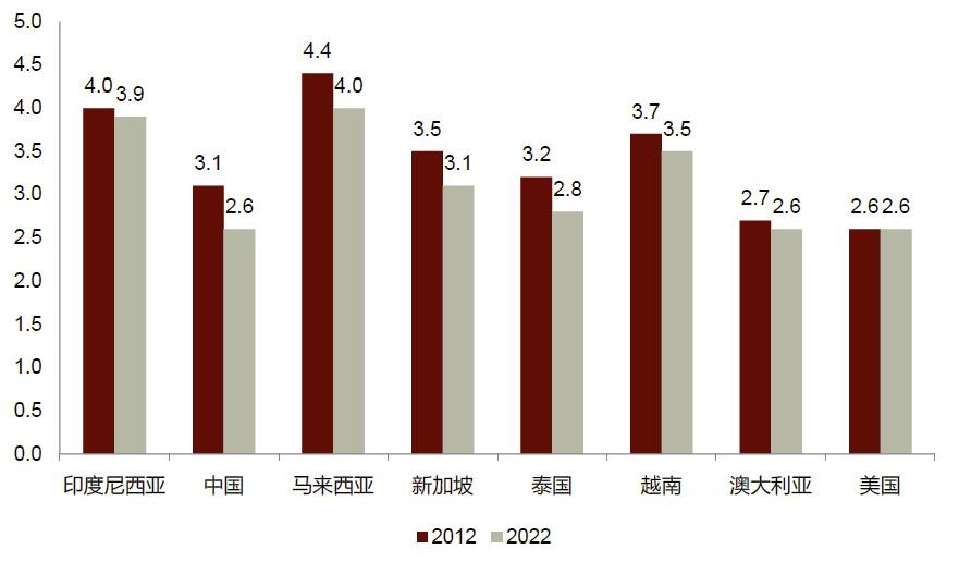 受21世纪初以来全球化和贸易自由化推动,中国经济不断发展,进而推动生产成本大幅上升。而东南亚重要国家印尼和越南最低工资在近年一直大幅低于中国最低薪资水平,凸显出两国明显的成本优势。中国工业用电成本也比印尼高出20%。我们认为将供应链放在中国带来的成本优势正在逐步下降。