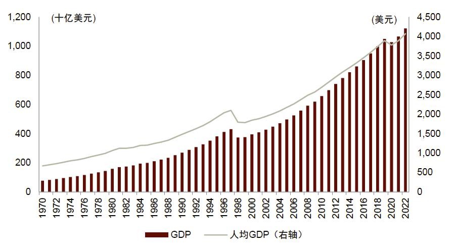 印尼经济发展迅速,2022年其GDP达到1.12万亿美元,对应1990-2022年CAGR达4.55%。与此同时,随着人均GDP从1990年的1,484美元攀升至2022年的4,074美元,个人财富也显著增长。1998年亚洲金融危机期间印尼经济水平折半,但在大宗商品出口强劲表现以及国内市场不断增长的推动下,此后印尼经济呈现有力复苏,1998-2022年CAGR达到4.7%。不过,虽然过去经济表现可圈可点,但长期以来外界一直认为印尼经济发展较为落后。从1990-2022年期间经济增速与规模来看,印尼4.6%的增速明显低于中国、越南、印度的9.03%、6.70%和5.95%。