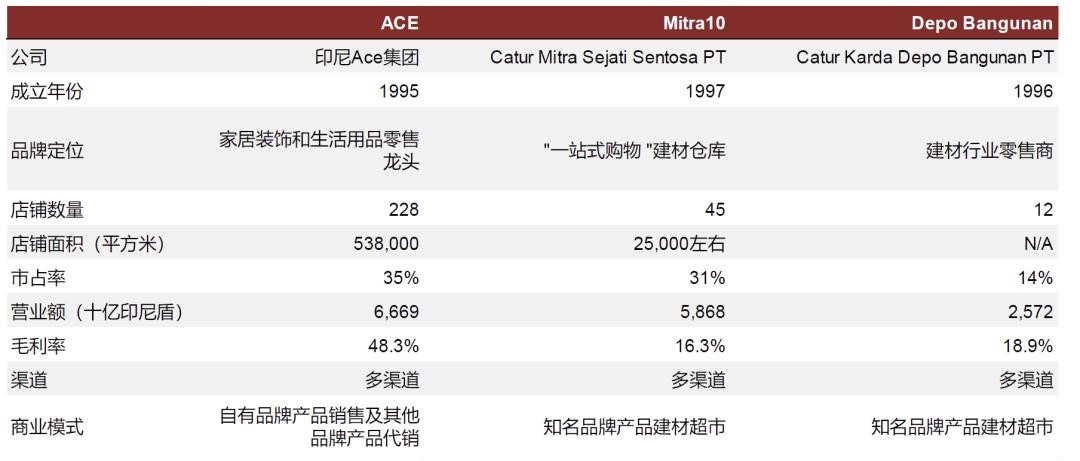 Mitra10和Depo Bangunan采取超市风格的业务模式,向消费者提供大量高端品牌家居装饰产品和建材。而ACE选择明显不同的战略,直接从中国工厂采购产品,然后打造成自有品牌产品。实践证明,这一独特的业务模式是成功可行的,例如ACE增速明显较高,在印尼全国拥有228家门店,而且其盈利能力非常强劲,2022年毛利率高达48.3%。