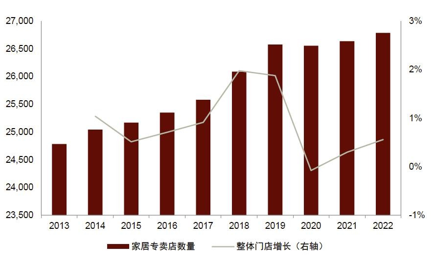 低层中产消费者经常光顾的单体门店数量从2014年的24,518家攀升至2019年的26,126家,但是疫情期间稳定在这一区间(2022年数量为26,250)。我们认为增速放缓主要是由于:(1)低层中产消费者的收入受疫情影响而缩水,因此在消费方面较为谨慎,选择推迟建房;(2)电商平台崛起,大范围进行促销,提供价格相对较低的家居用品。
