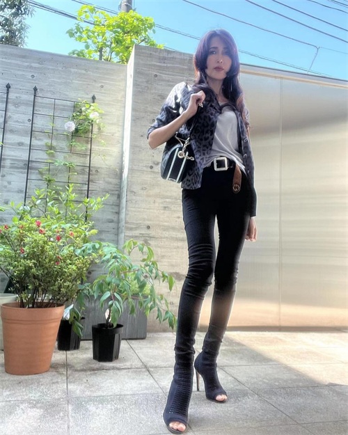 静香的御姐风出街造型十分简单,身姿挺拔状态在线,重点突出曼妙曲线。灰色豹纹衬衫敞开穿内搭白色上衣,很是潇洒。丈夫木村拓哉偏爱豹纹元素的单品,静香爱屋及乌也经常穿在身上,夫妻俩偶尔隔空情侣装已是平常事。一条黑色修身裤加上一双十公分高跟短靴让细腿更显长,仿佛脖子以下脚趾以上全是腿,惊人比例像极了漫画里走出来的二次元美少女。