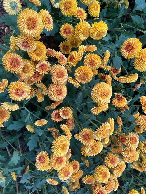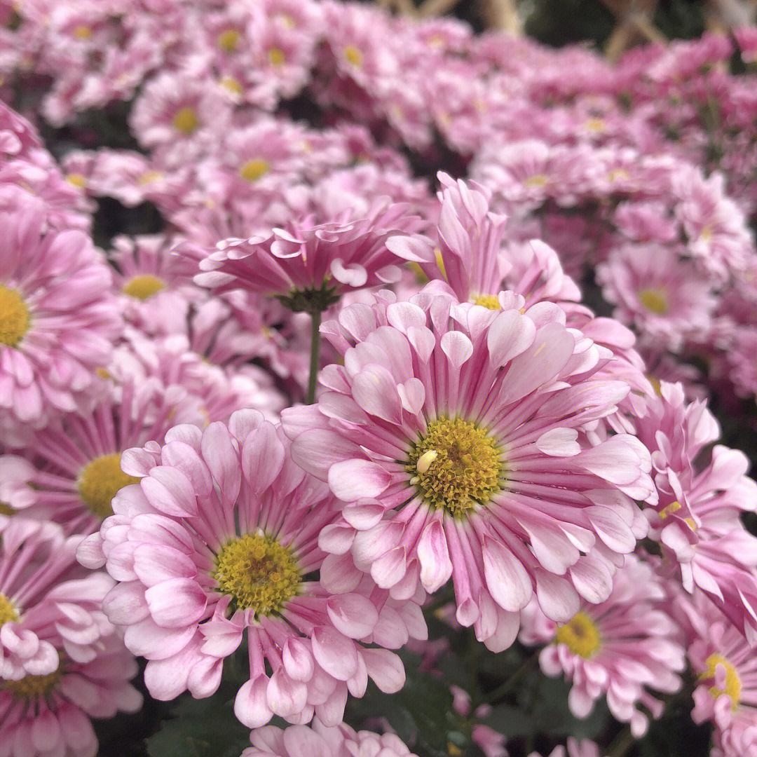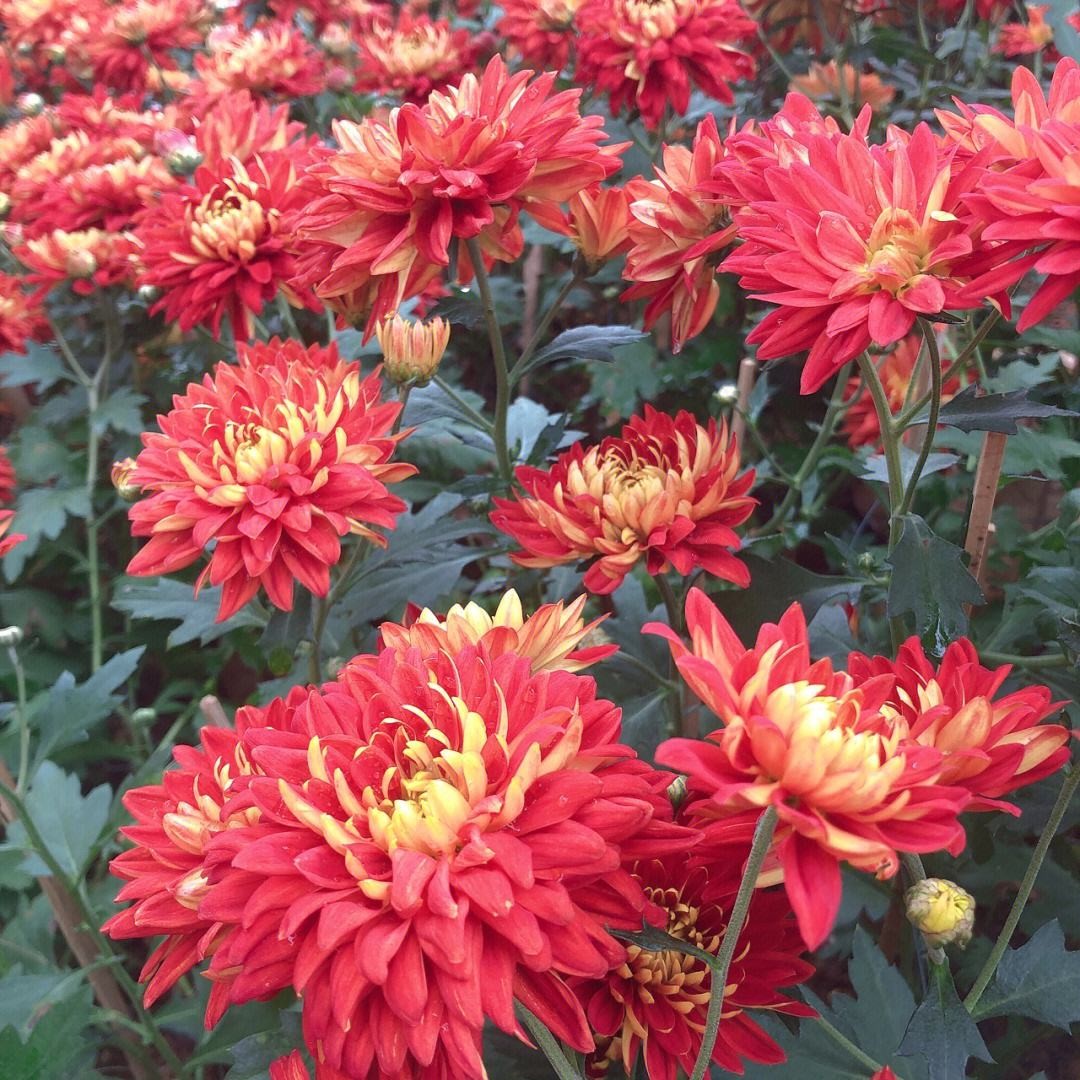 接着是红色和黄色区域,一片火热而热情洋溢。这里有各式各样的盆栽类菊花,在阳光下散发出迷人的光彩。看似简单的颜色组合却能传递出浓厚、活力四溢。