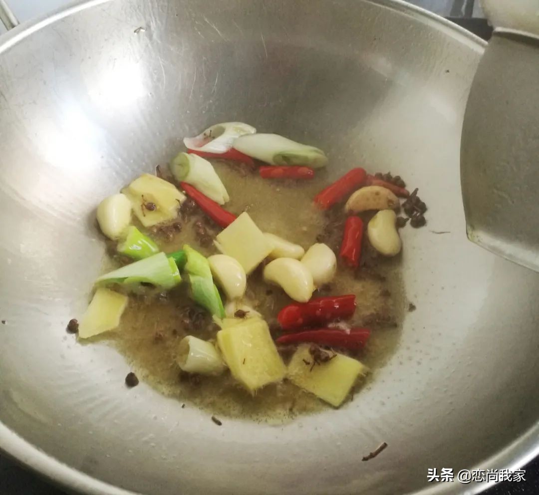 3、锅烧热放油,放花椒、葱段、大蒜、姜片和泡椒,小火煸香。