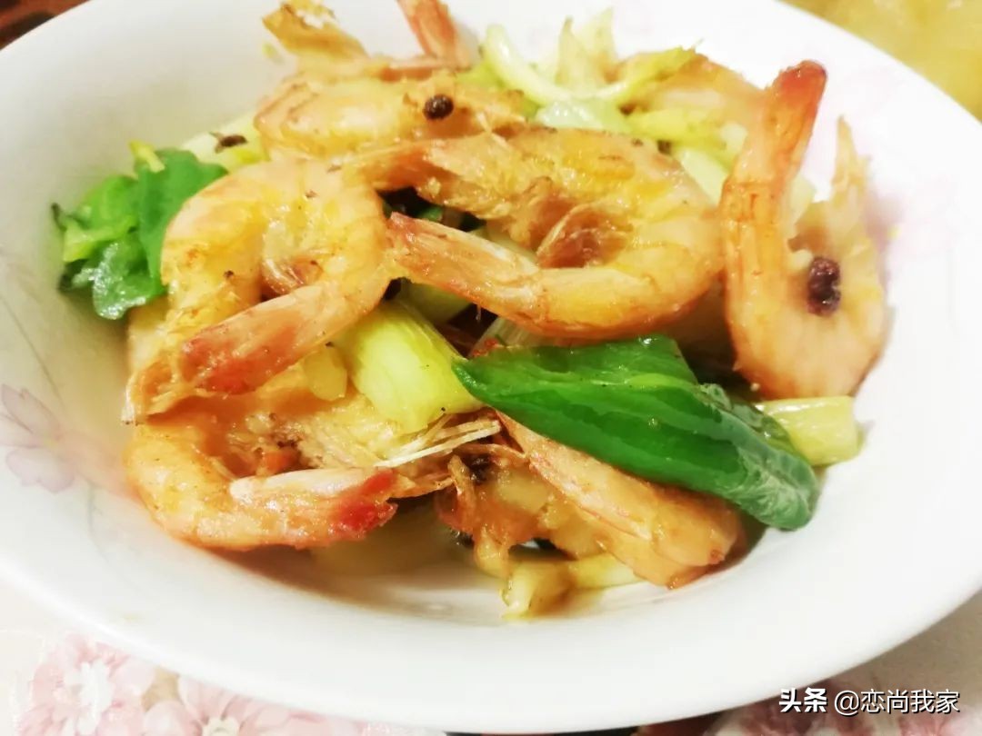 3、锅中留余油,放葱、姜片、蒜粒、辣椒小火煸香。放入爆好的虾翻炒,放芹菜,放盐调味,再放花椒粉,黑胡椒粉,白糖少许翻炒均匀即可。起锅撒上葱花。一道高大上的油爆虾就做好了。