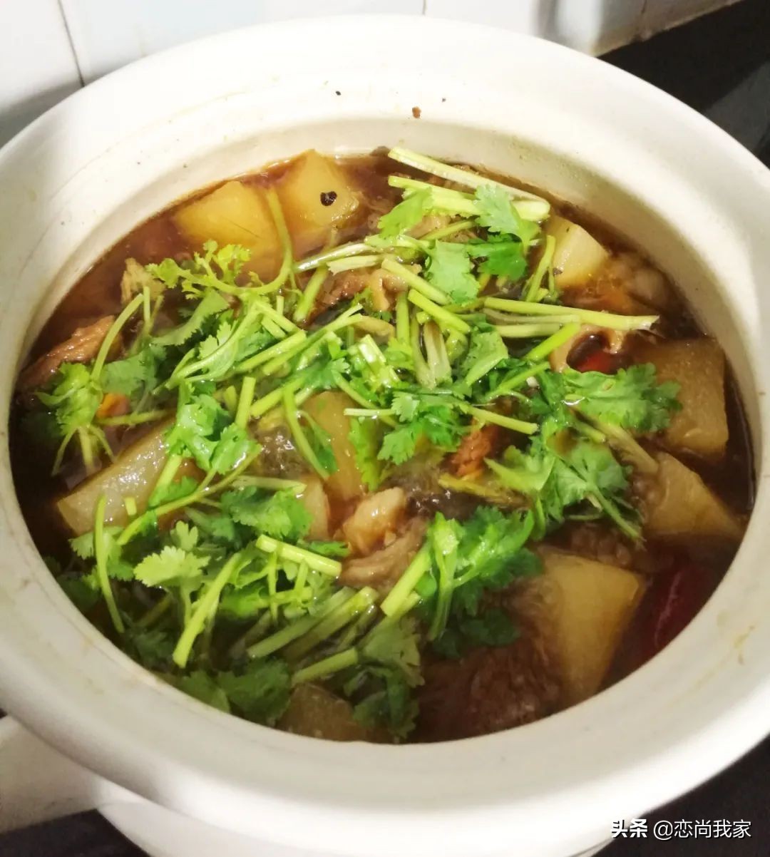 5、倒入砂锅,加适量的水,不要加过多的水。先大火烧开,再小火慢炖1~1.5小时左右。放白萝卜,炖10~15分钟。起锅放香菜,放味精、胡椒粉。