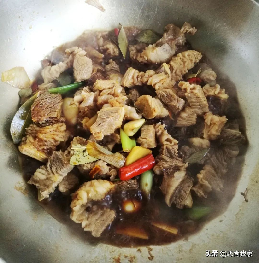 4、放牛肉翻炒。放生抽、盐炒入味,放冰糖小块、八角、陈皮、香叶炒。倒入啤酒烧。翻炒烧入味。