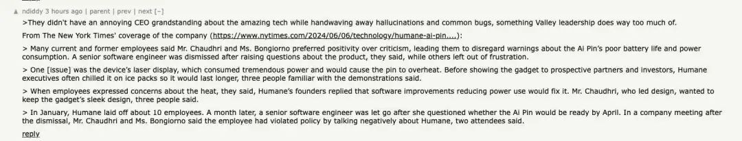 璁稿鐜颁换鍜屽墠浠诲憳宸ヨ〃绀猴紝Chaudhri 鍏堢敓鍜?Bongiorno 濂冲+鍊惧悜浜庨紦鍔辩Н鏋佸弽棣堬紝鑰屽拷瑙嗘壒璇勶紝杩欏鑷翠粬浠拷鐣ヤ簡鍏充簬 Ai Pin 鐢垫睜瀵垮懡鐭拰鍔熻€楅珮鐨勮鍛娿€傛湁浜鸿〃绀猴紝涓€浣嶉珮绾ц蒋浠跺伐绋嬪笀鍥犳彁鍑轰骇鍝侀棶棰樿€岃瑙i泧锛屽叾浠栧憳宸ュ垯鍥犲け鏈涜€岀鑱?.....