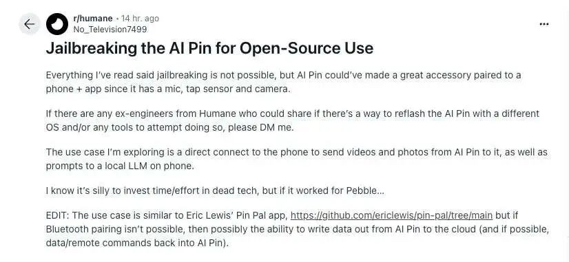 https://www.reddit.com/r/humane/comments/1it6nny/jailbreaking_the_ai_pin_for_opensource_use/