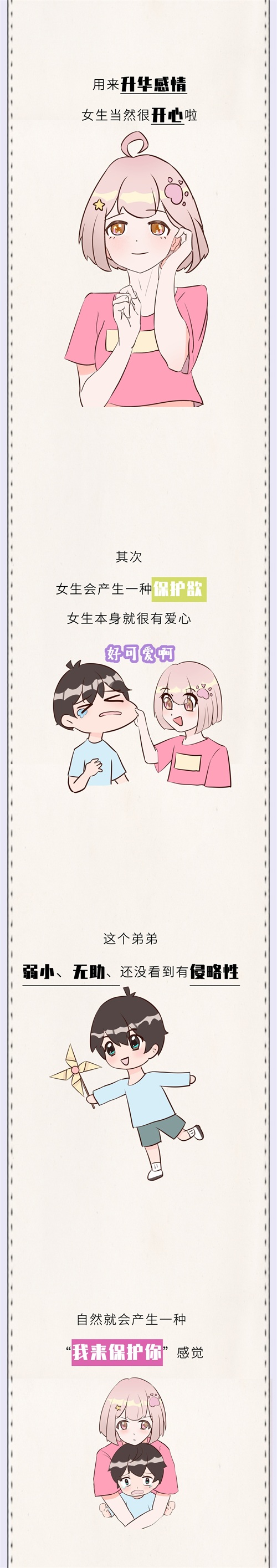 其次,女生会产生一种保护欲,女生本身就很有爱心,看到这个弟弟弱小、无助、还没有侵略性,自然就会产生一种“我来保护你”感觉。当然这需要一个前提,男生的年龄、形象不能太离谱。