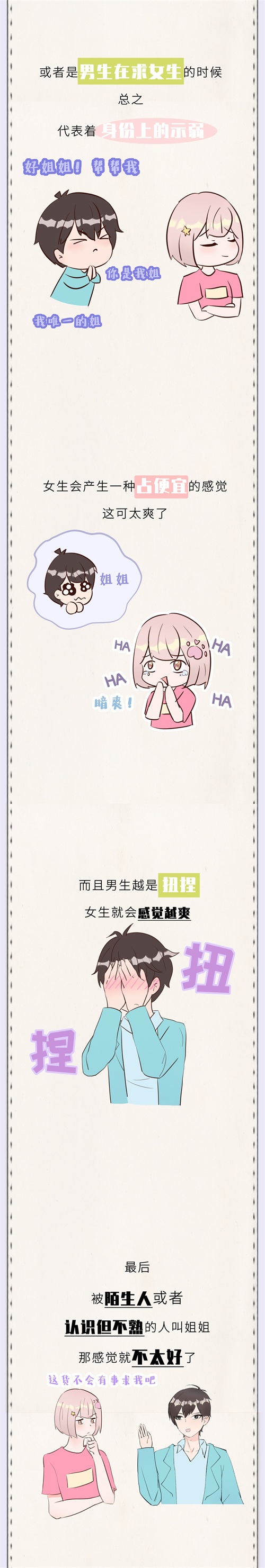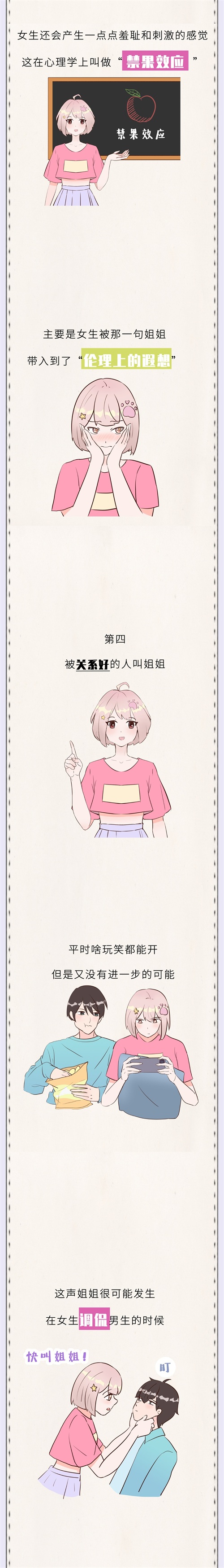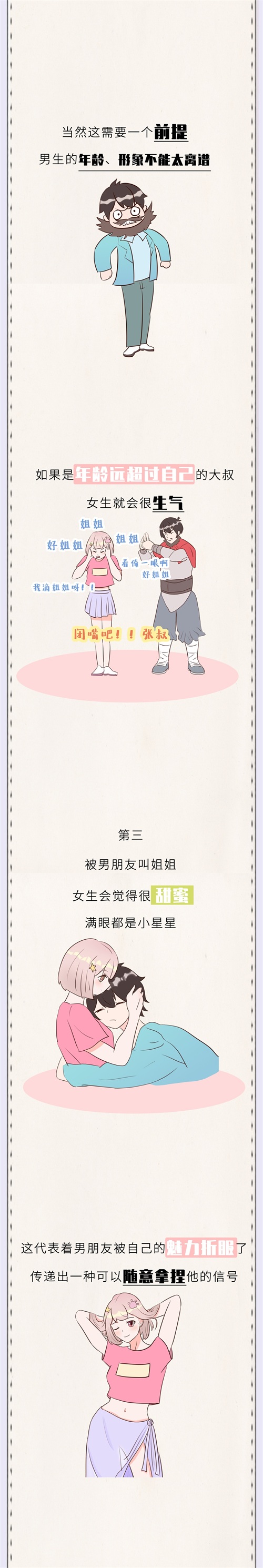第三,被男朋友叫姐姐,女生会觉得很甜蜜,满眼都是小星星,这代表着男朋友被自己的魅力折服了,传递出一种可以随意拿捏他的信号。
