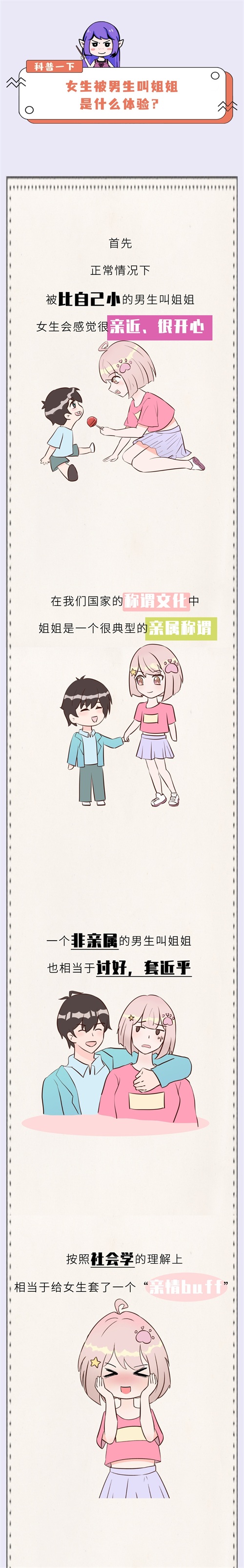 首先,正常情况下,被比自己小的男生叫姐姐,女生会感觉很亲近、很开心在我们国家的称谓文化中,姐姐是一个很典型的亲属称谓。一个非亲属的男生叫姐姐也相当于讨好,套近乎,按照社会学的理解上,相当于给女生套了一个“亲情buff”用来升华感情,女生当然很开心啦。