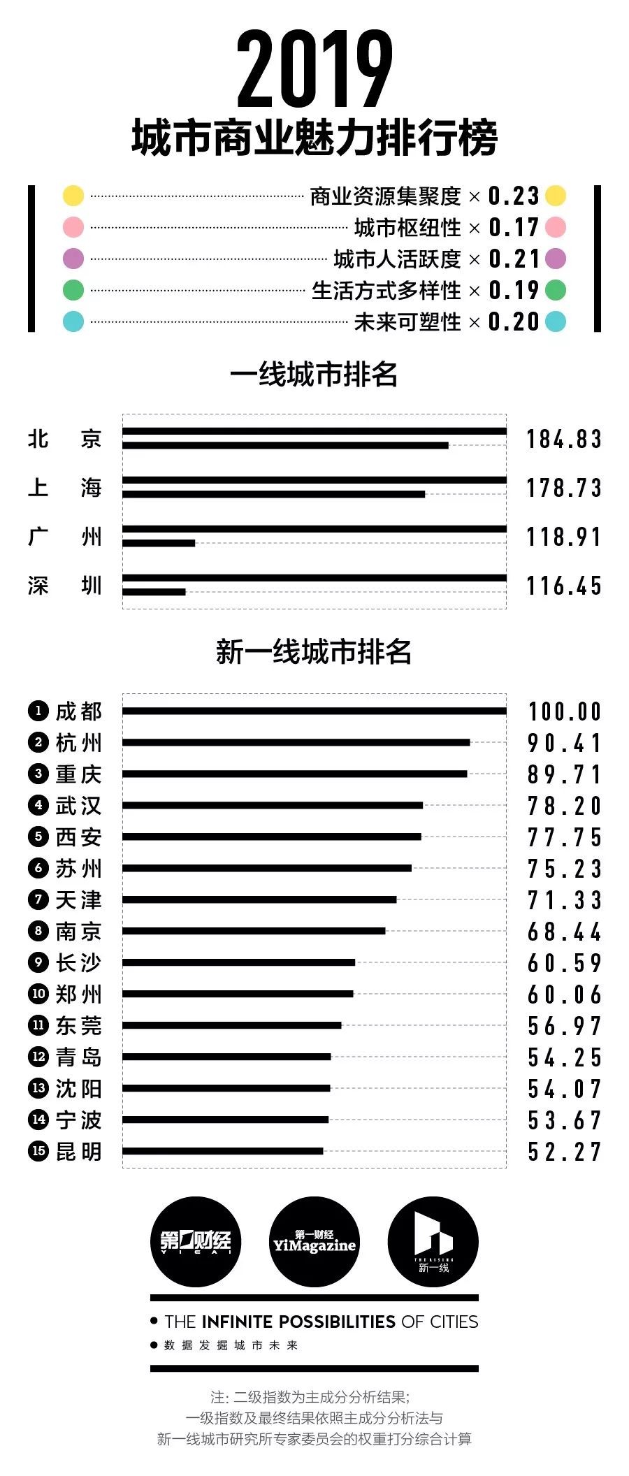 这是第一财经·新一线城市研究所制作《城市商业魅力排行榜》的第四年。与往年一样,在收集170个主流消费品牌的商业门店数据、18家各领域头部互联网公司的用户行为数据和数据机构的城市大数据后,按照商业资源集聚度、城市枢纽性、城市人活跃度、生活方式多样性和未来可塑性五大维度指数来评估337个中国地级及以上城市。算法也和以往保持一致:综合新一线城市研究所专家委员会打分的方式及主成分分析法综合得出最终结果。