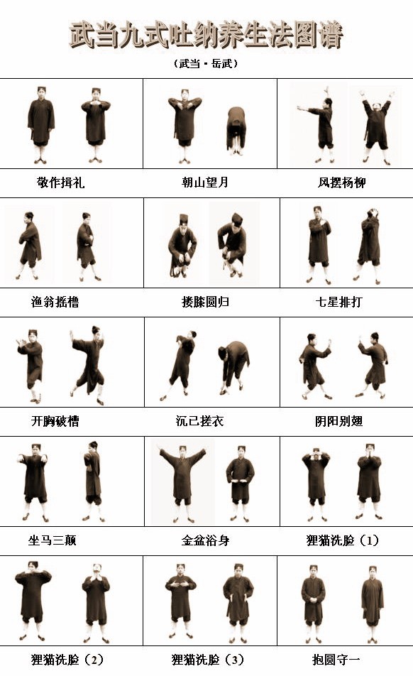 武当九式吐纳养生法又名武当九式吐纳秘功或武当道传不老青松功,相传由武当丹道养生祖师吕洞宾(号纯阳子)所遗留,千百年来一直在武当道内秘传口授,依武当道内沿传之规矩,至今已经辈列第23代。此套功法是武当纯阳门系列功法之一,是修真悟道,延年益寿的必经法门。