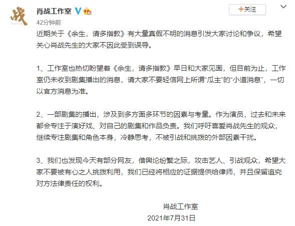 7月31日晚,肖战工作室在社交平台发文辟谣称,工作室未收到《余生,请多指教》剧集播出的消息,全文如下: