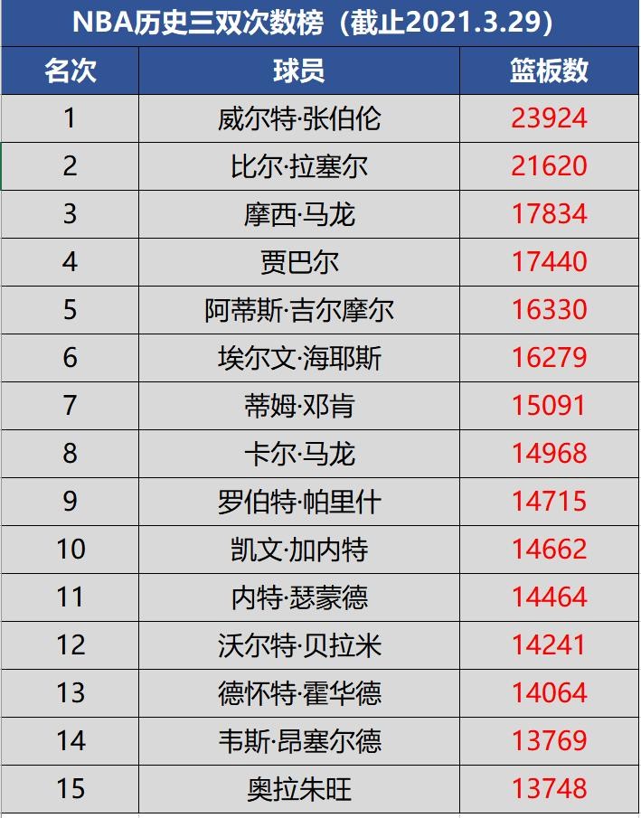 所谓“称霸篮下就能控制全场”,NBA古往今来诞生过很多篮板球高手,他们大多都是球队内线的巨人,今天我们就来一起看一看NBA历史总篮板榜TOP15都是哪些球员,具体排名如下图(数据截止到2021.3.29)。