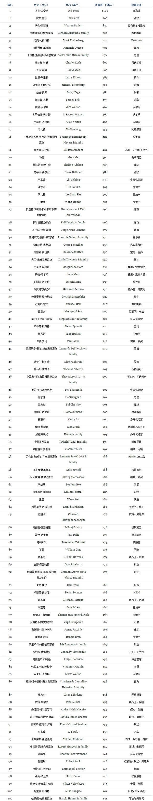 ▼2018年全球亿万富豪榜TOP100