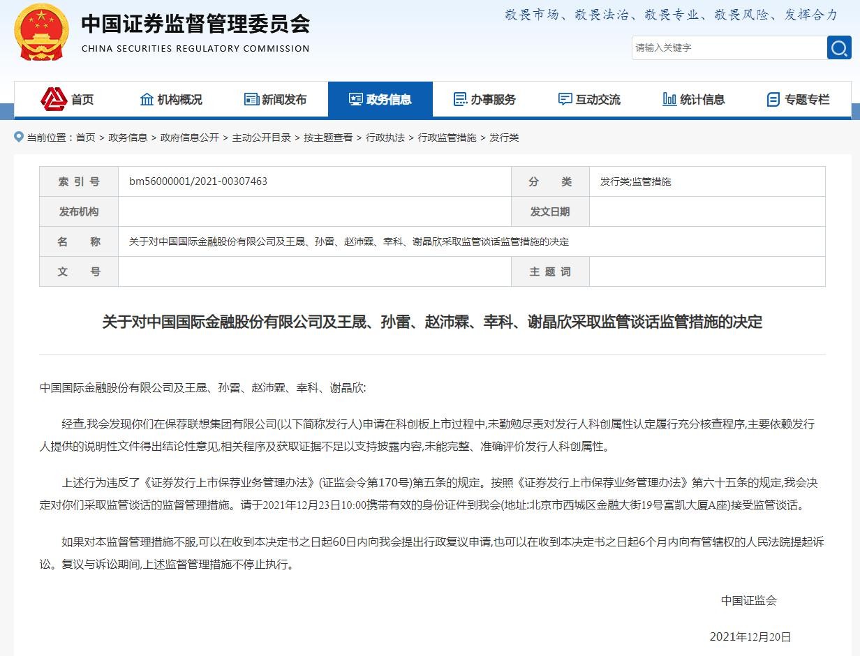 公告只是证监会对中金公司及保荐联想的涉事个人的监管谈话,但我们却能够从文中看出部分暗指联想的信息。