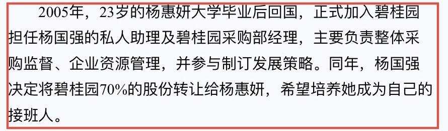 刚回来那一年,杨惠妍出任杨国强私人助理,并且将碧桂园70%股权转让给她。