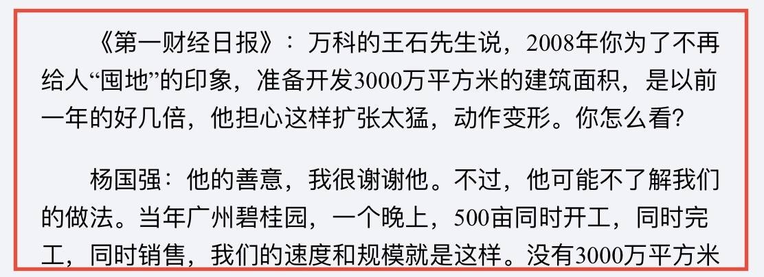 多年前,杨国强疯狂扩张,看得王石瑟瑟发抖,他就担心老弟操之过急,扩张太猛,动作变形。