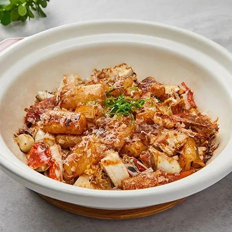 3. 梭子蟹小块加入啫啫酱盒生粉拌均,砂锅烧热放入适量精制油,倒入葱姜干葱粒煸香后放入拌好啫啫酱的梭子蟹,加盖中大火焗烧5到6分钟,放入煎炒好的肠粉加盖继续焗烧1到2分钟后,喷香料酒撒上木鱼花和葱花即可。