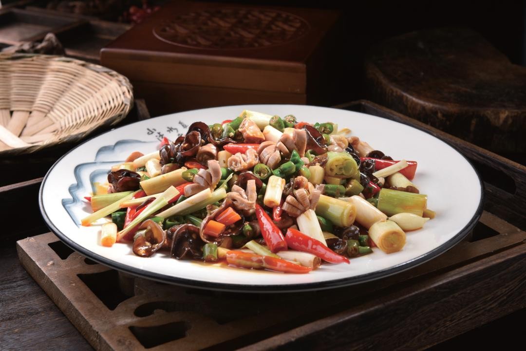 原料:带底板的千层肚400克、红小米椒节50克、二荆条青辣椒节100克、香葱节50克、干青花椒50克、姜片、葱段、香料、盐、味精、鸡精、辣鲜露、鲜汤、色拉油各适量制作:1.用流动水把千层肚冲漂一段时间,放入加有姜片、葱段、香料的清水锅,煮20分钟后,捞出来再冲漂一会儿,沥水后切成条待用。2.锅里放色拉油烧热,先投入姜片、香葱节、红小米椒节、二荆条青辣椒节和20克干青花椒炒香,再掺鲜汤烧开。下千层肚条稍煮,其间加盐、味精、鸡精和辣鲜露调好味,随后出锅盛在窝盘里,撒上剩下的干青花椒,最后浇热油激香即成。