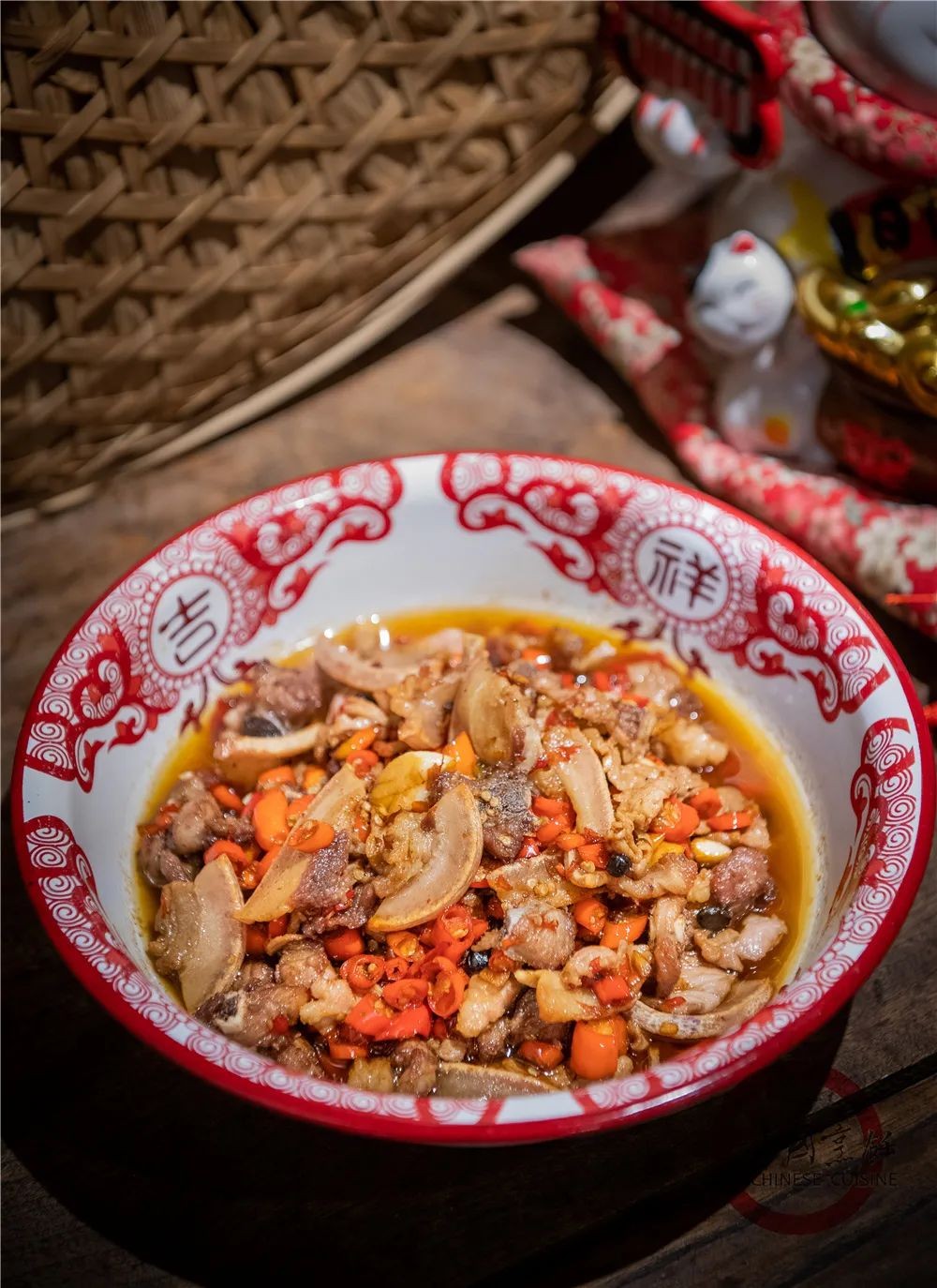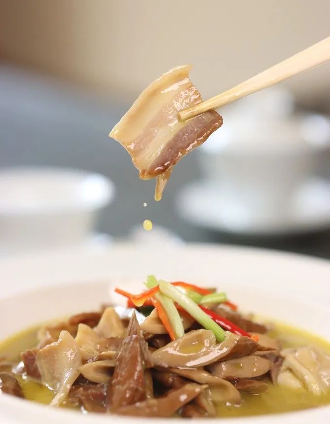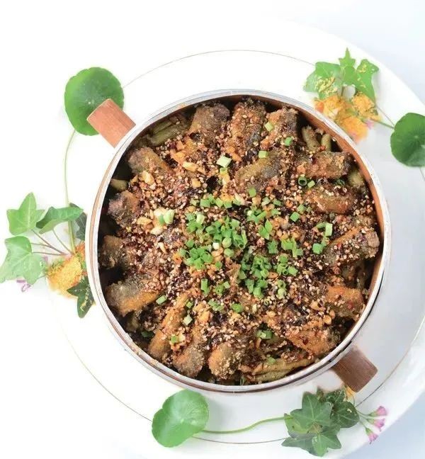 这道菜是在“咸烧白”的基础上改良而成,咸烧白的口感是肉片软嫩,芽菜脆香。通过丰富口感来“改变”它的油腻感——让人感觉吃起来香而不腻。