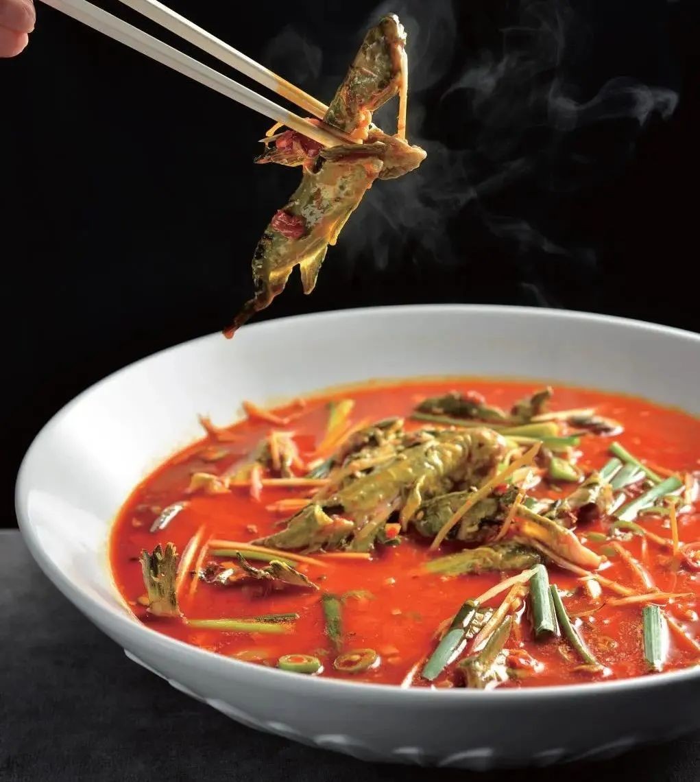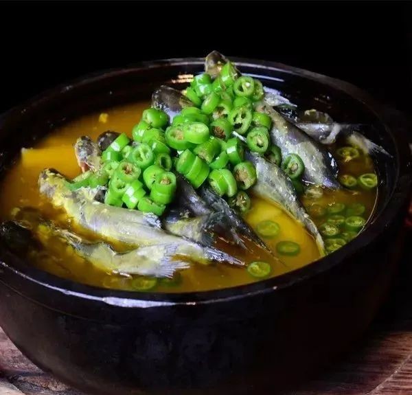 3.把飞过水的三角峰下入蔬菜汁中,开小火煮入味后,调家常味,起锅装入烧烫的石锅内,最后浇上用藤椒油炝香的青椒圈,即成。