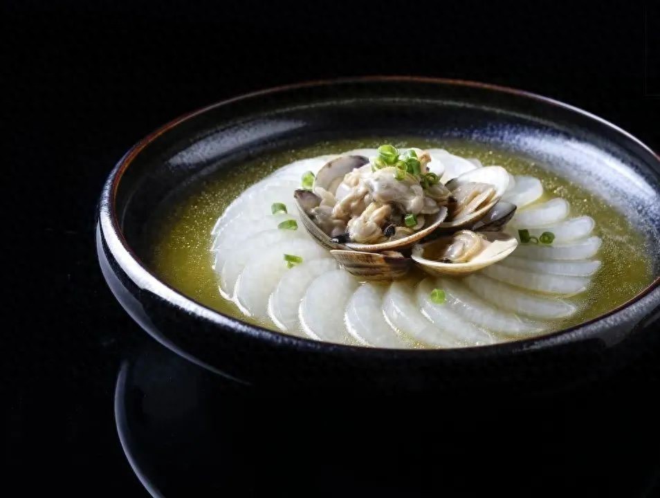 2. 萝卜切圆片加鸡汤蒸耙,放入调料;放入蚬子撒上葱花即可;
