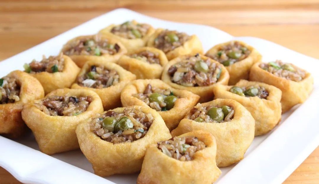 原料:远口豆腐600克、白糯米400克、豌豆米200克、鸡蛋2个、葱花10克、盐4克、酱油8毫升、熟猪油30克、食用油适量制作:1.把白糯米淘洗干净,用温水浸泡2小时,控水后放入木甑子蒸熟,取出来加豌豆米、盐、酱油、熟猪油、葱花拌匀成馅料。另把豆腐捣成泥,加盐和鸡蛋液搅匀上劲,搓成丸子,下入热油锅中炸至色金黄且酥脆时,捞出来沥油。