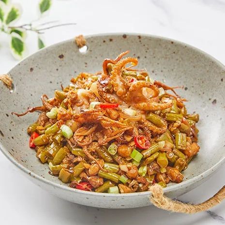 2. 锅烧热,炒香五花肉粒,入小料、继续炒香,再加酸菜末、焯水过的酸豆角、八爪鱼炒干水气,喷黄酒、香醋,下入鲜上鲜酱油、蚝油、鸡粉、糖、胡椒粉炒透,勾薄芡,淋红油、麻油,出锅装盘。