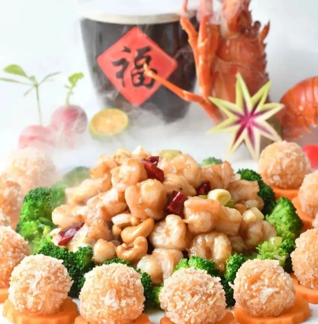 原料:澳洲小青龙1只、水晶虾仁200克、粉丝200克、熟腰果100克、西兰花200克、葱白碎50克、胡萝卜、樱桃萝卜、心里美萝卜、干辣椒节、花椒、姜末、蒜末、生粉、白糖、醋、盐、味精、鸡精、色拉油各适量制作:1.澳洲小青龙宰杀后冲洗干净,取出龙虾净肉。西兰花焯水备用。2.将龙虾净肉剁碎,加入姜末、葱白碎、生粉搅拌均匀,做成虾球的形状,将事先泡发好的粉丝切成小段,粘在虾球表面。3.将水晶虾仁滑油至七分熟定型。另起锅入油,加入干辣椒节、花椒、姜末、蒜末煸香,下入水晶虾仁和熟腰果,再调入盐、味精、鸡精、白糖、醋翻炒均匀,勾芡翻匀后起锅装盘。另将虾球入油锅炸熟捞出,放在胡萝卜削成的底座上,摆上焯熟的西兰花,用心里美萝卜和樱桃萝卜略加点缀即成。说明:另一种做法是,不用水晶虾仁,取一半龙虾净肉做宫保虾丁,另一半做成虾球即可。