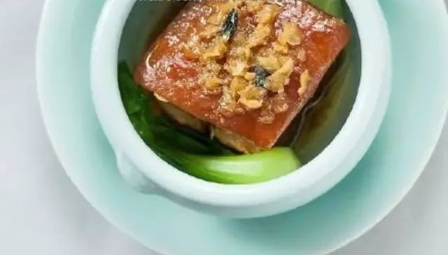 2、将五花肉块放入卤水中用高压锅煮5分钟,捞出待用;将压好的肉放入碗中,加泡小米辣、蒸鱼豉油、豆豉、味精、鸡精、胡椒粉,上柜蒸1小时,取出,将肉扣在盘中,皮面向上装入盛器,放入焯熟的油菜心,淋原汁即可。