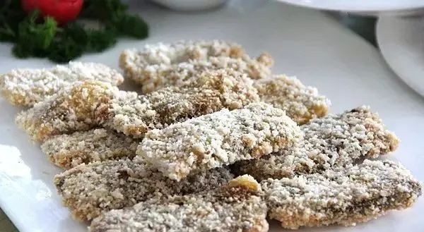 6、脆皮咸烧白制法:用糯米纸把一片蒸好的咸烧白和芽菜末包严实,裹上脆炸浆并拍上面包糠,最后下油锅炸定形逐一摆盘即成。
