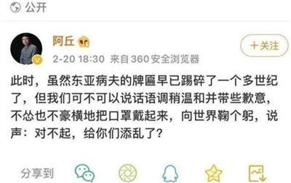 2020年,阿丘再次犯下了错误,引起众怒,因为他在社交平台上发布了一些关于疫情的不当言论。