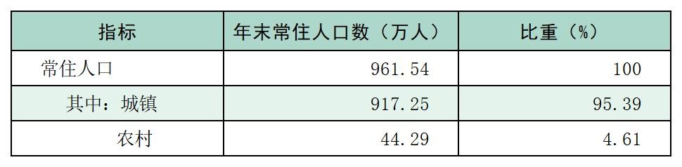 2023年年末全市常住人口961.54万人,其中城镇常住人口917.25万人,占常住人口比重(常住人口城镇化率)95.39%。