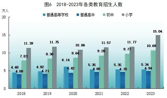 年末共有普通高等学校14所,全年招生5.34万人,在校学生15.71万人;普通高中68所,招生4.94万人,在校学生14.25万人;初中175所,招生10.69万人,在校学生29.54万人;小学430所,招生15.04万人,在校学生73.19万人;幼儿园1130所,招生9.97万人,在园幼儿33.89万人。学龄儿童毛入园率101.84%,小学毕业升学率100%,初中毕业升学率98.72%,普通高中毕业升学率98.52%。