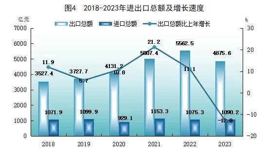 全年进出口总额5965.8 亿元,比上年下降10.5%。其中出口4875.6亿元,下降12.8%;进口1090.2亿元,增长1.4%。实现外贸顺差3785.4亿元。