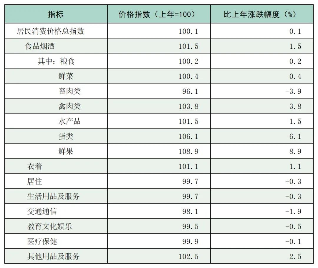 全年居民消费价格比去年上涨0.1%,其中消费品价格下降0.3%,服务价格上涨0.5%。分类别看,食品烟酒价格上涨1.5%,其他用品及服务和衣着价格分别上涨2.5%和1.1%;交通通信、教育文化娱乐、居住、生活用品及服务和医疗保健价格分别下降1.9%、0.5%、0.3%、0.3%和0.1%。工业生产者出厂价格下降0.8%,其中轻工业价格上涨1.0%,重工业价格下降2.2%。