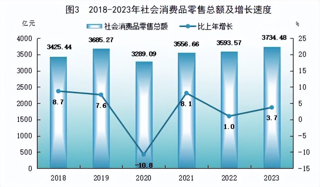 全年社会消费品零售总额3734.48亿元,比上年增长3.7%。从消费形态看,商品零售3449.74亿元,增长2.9%,餐饮收入284.74亿元,增长14.6%。