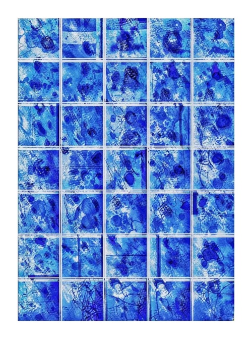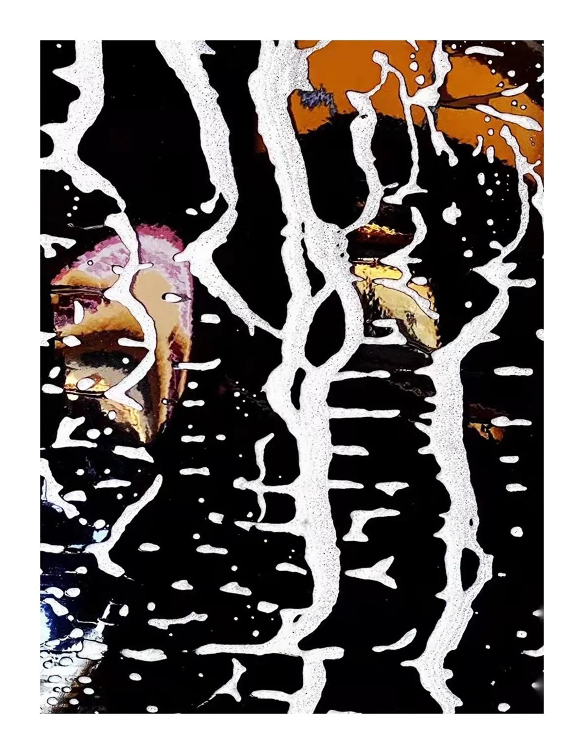 作者由此引申出了这组作品的主题。那些洗车泡沫跳跃的点连成了流淌的线,与背景色彩铺陈出奇特的视觉引力和心灵乐章,进而开启情感联觉和鸣奏的境界。