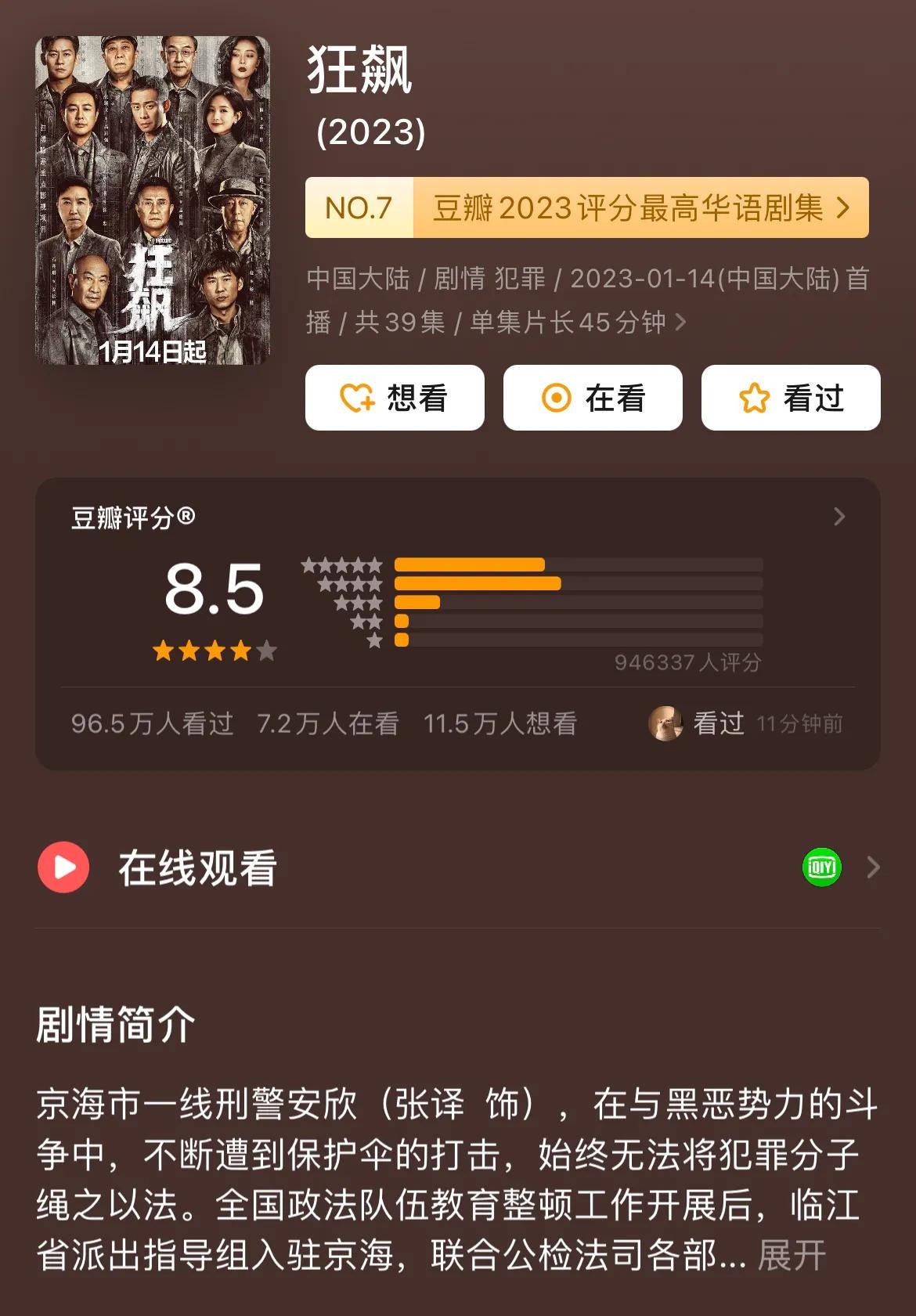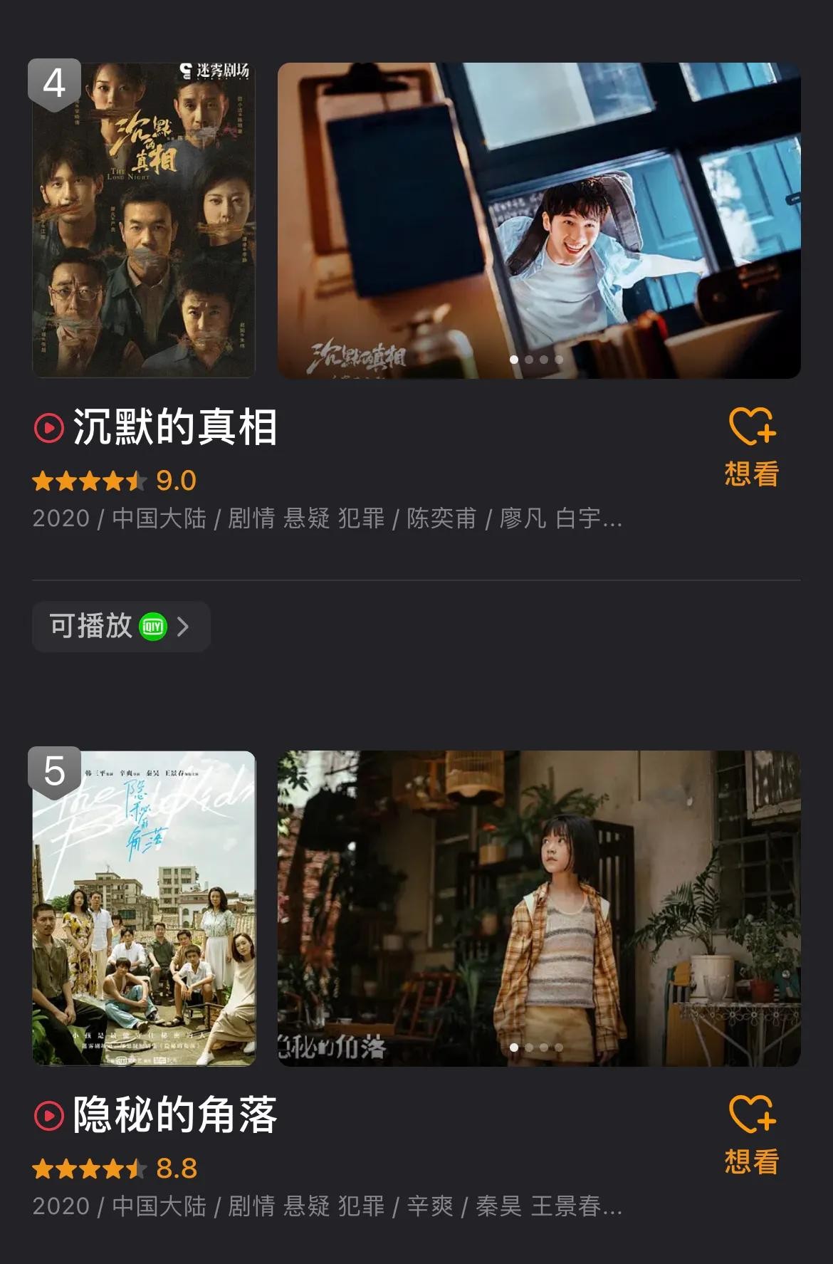 犯罪或悬疑剧《沉默的真相》、《隐秘的角落》、《白夜追凶》、《漫长的季节》、《狂飙》