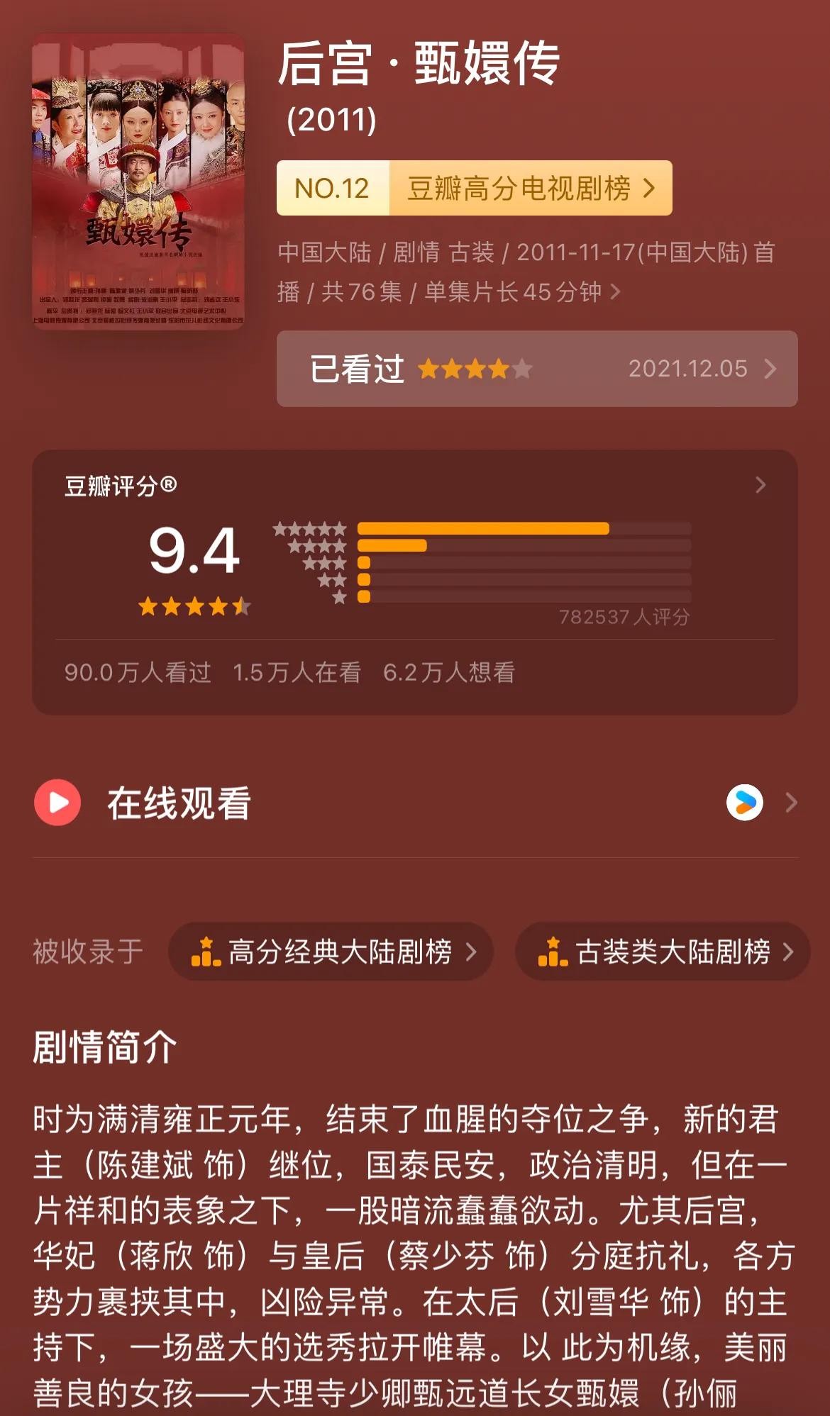 推荐指数:⭐⭐⭐⭐⭐(核爆式神剧,衍生出甄嬛学,百看不厌,去掉果郡王和甘露寺剧情就更完美了[苦瓜],力荐)