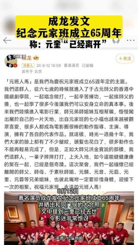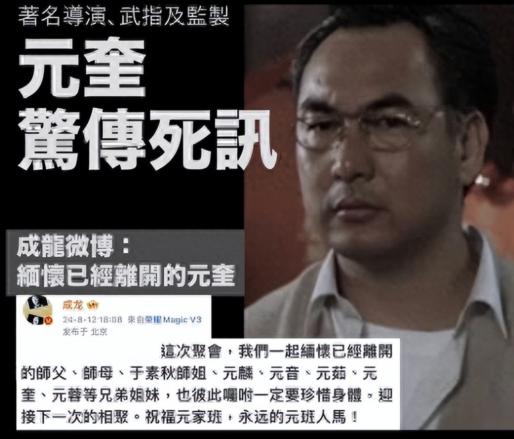 7 月 12 日,成龙发文透露“元家班”成立 65 周年,同时遗憾公布元奎死讯。