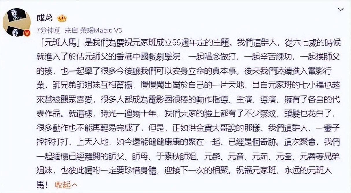 7 月 12 日,成龙怀着沉重的心情发文,在庆祝“元家班”成立 65 周年的同时,也向世人公布了元奎离世的噩耗。